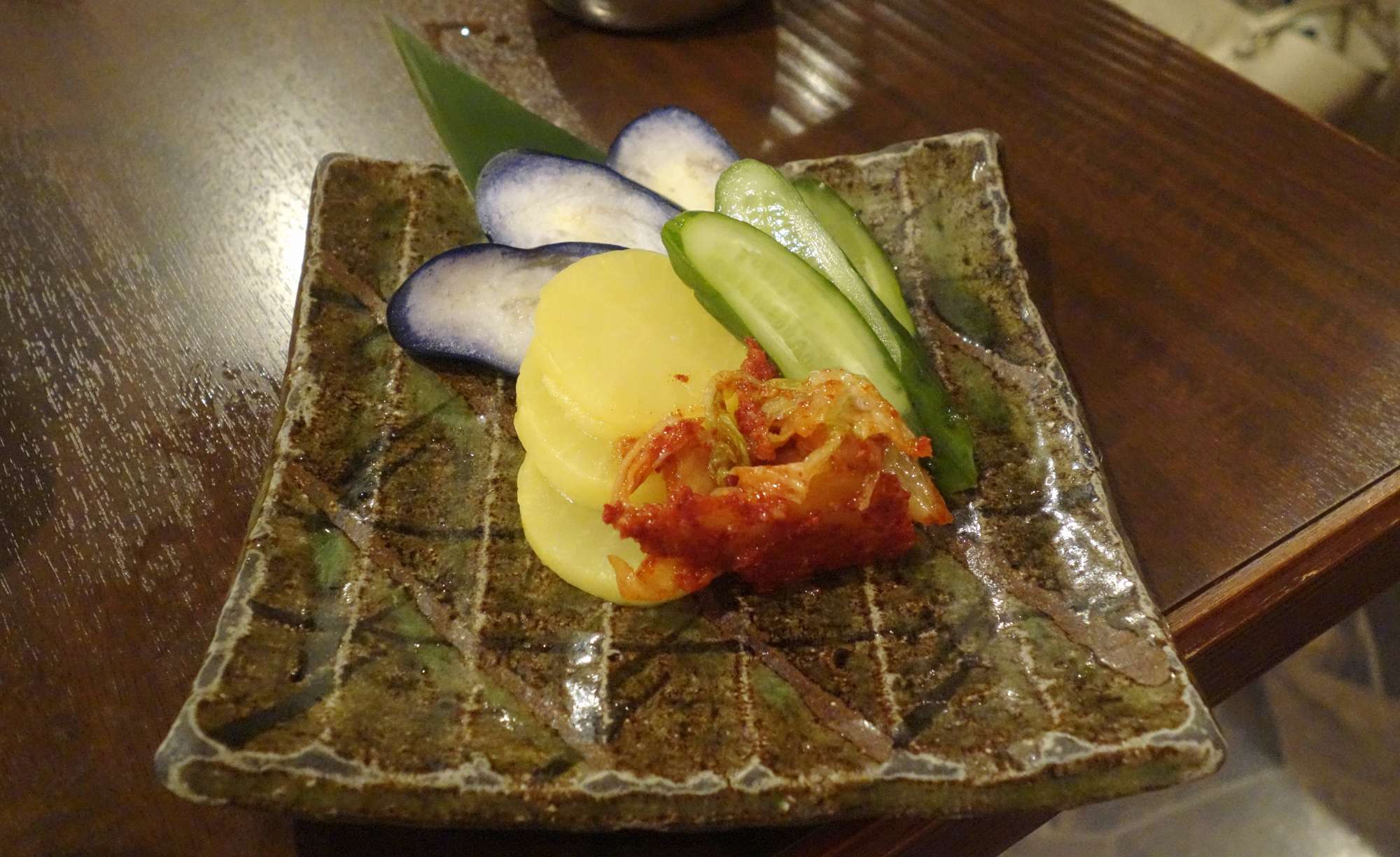 キムチ、浅漬、沢山がセットになった漬け物盛り合わせ680円を食べて本格的な食事のウォーミングアップを行い