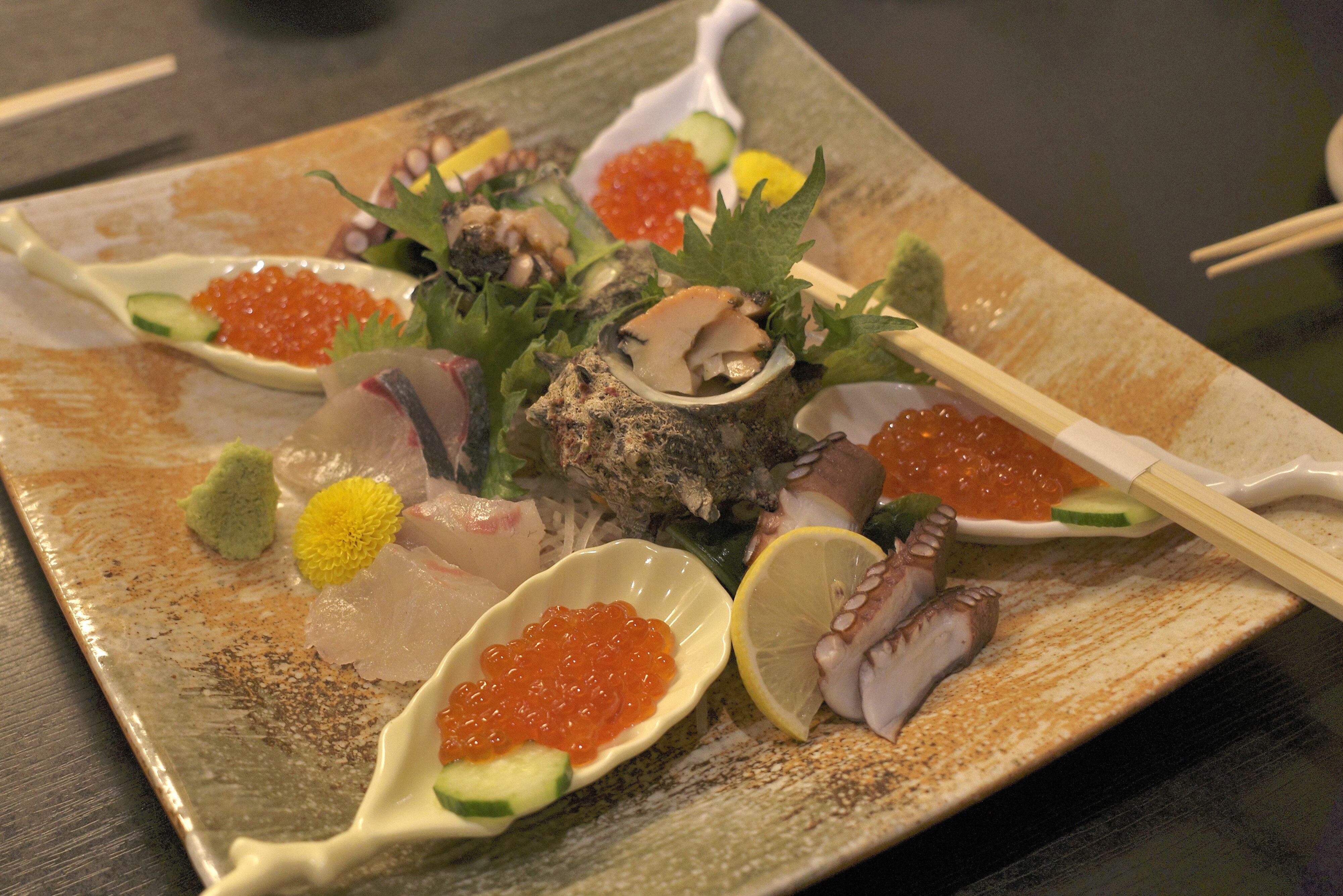 その後はプチプチっと弾ける歯ざわりと濃厚な旨味のいくら、コリコリ食感のさざえ、新鮮な白身魚が乗った刺盛りが登場!