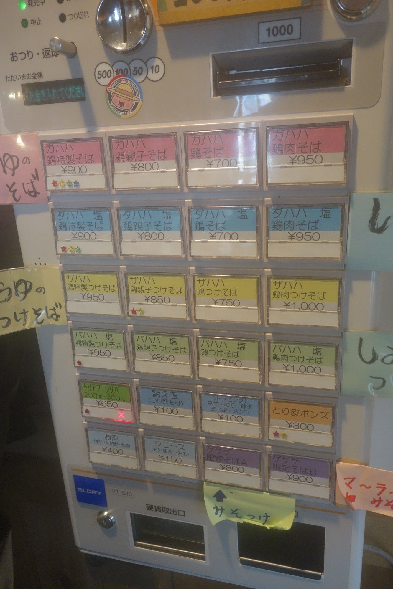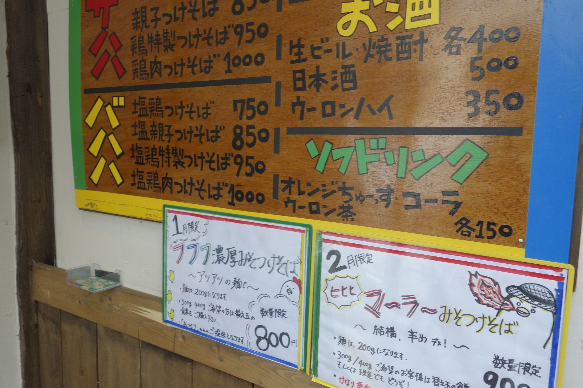つけそばメニューやドリンクメニューなどが掲示。その後、意を決して店内へと進みます。
