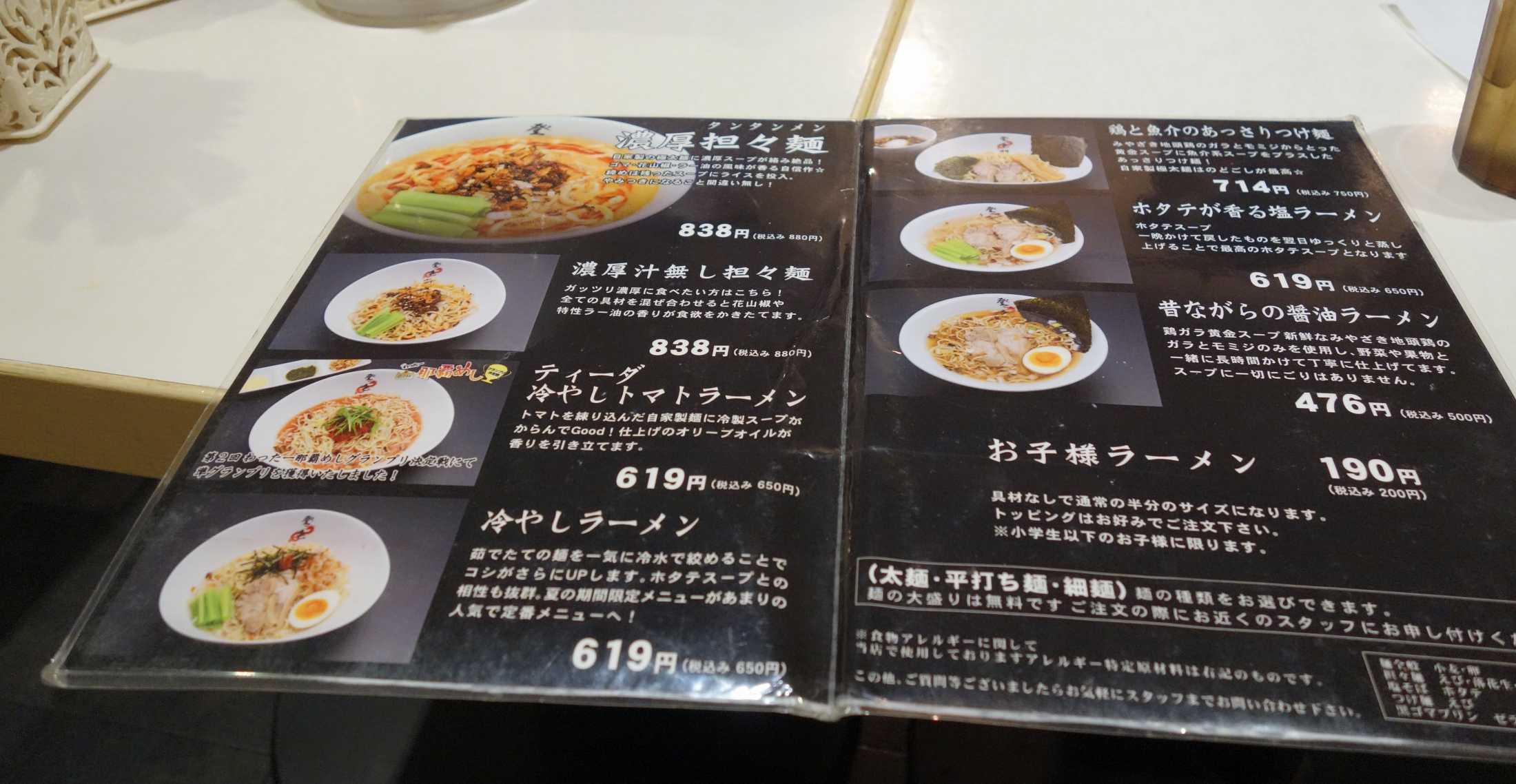 今回注文した濃厚担々麺880円の他、汁なし担々麺やホタテの旨味を感じそうな塩ラーメンに
