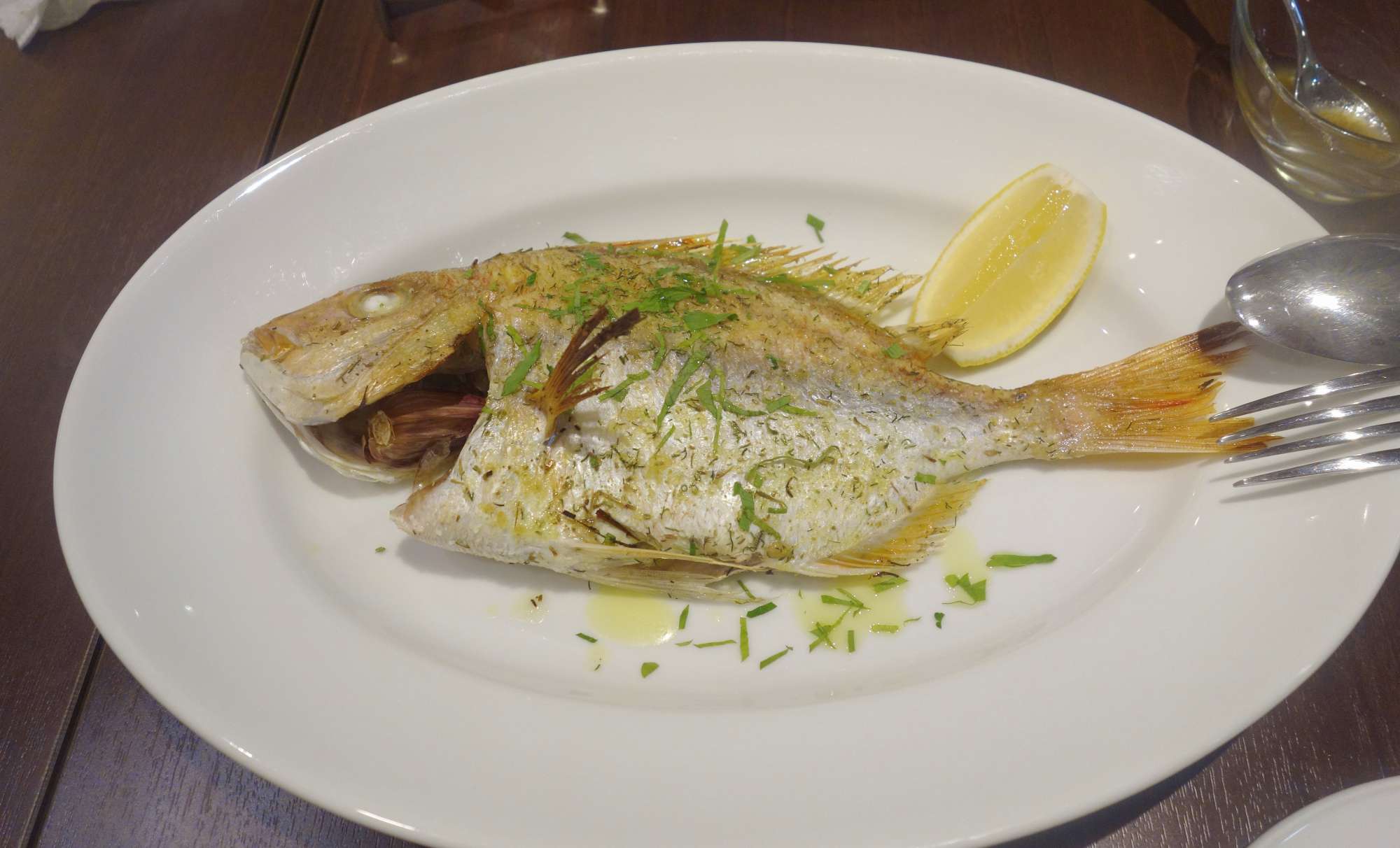 その後注文してから1時間ほどで完成したチダイの1本丸ごとオーブン焼き1500円は