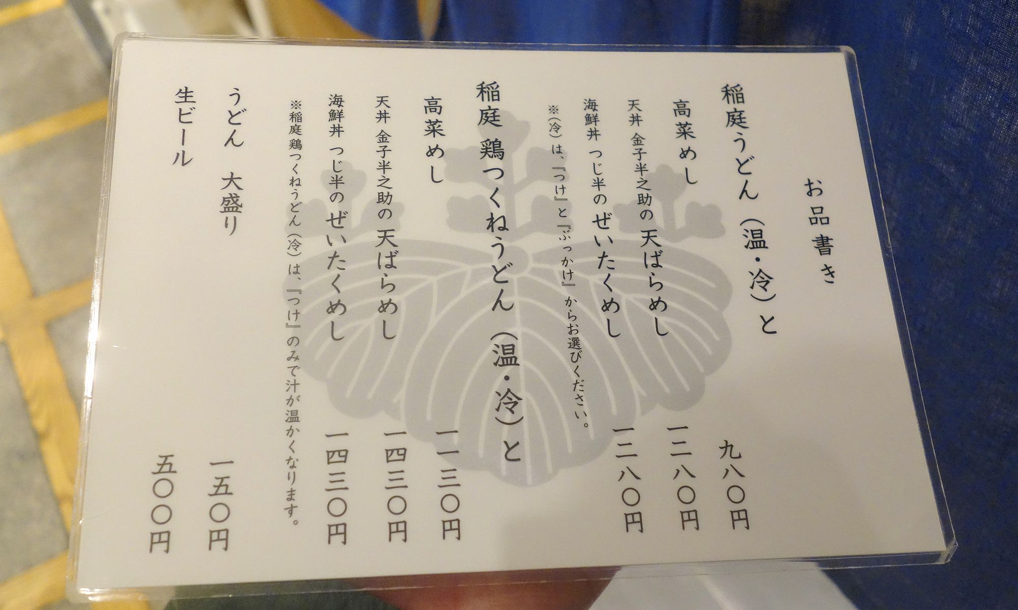 お店に入る前にメニューを見てみると、うどんメニューが稲庭うどんと鶏つくねうどんの2種類あり、セットのご飯が高菜めし、天ばらめし、海鮮贅沢飯の3種類と組み合わせて、計6種類(うどんは温かいもの、冷かけ、冷ぶっかけがあり、それらを含めれば18種類)バリエーションがあります。