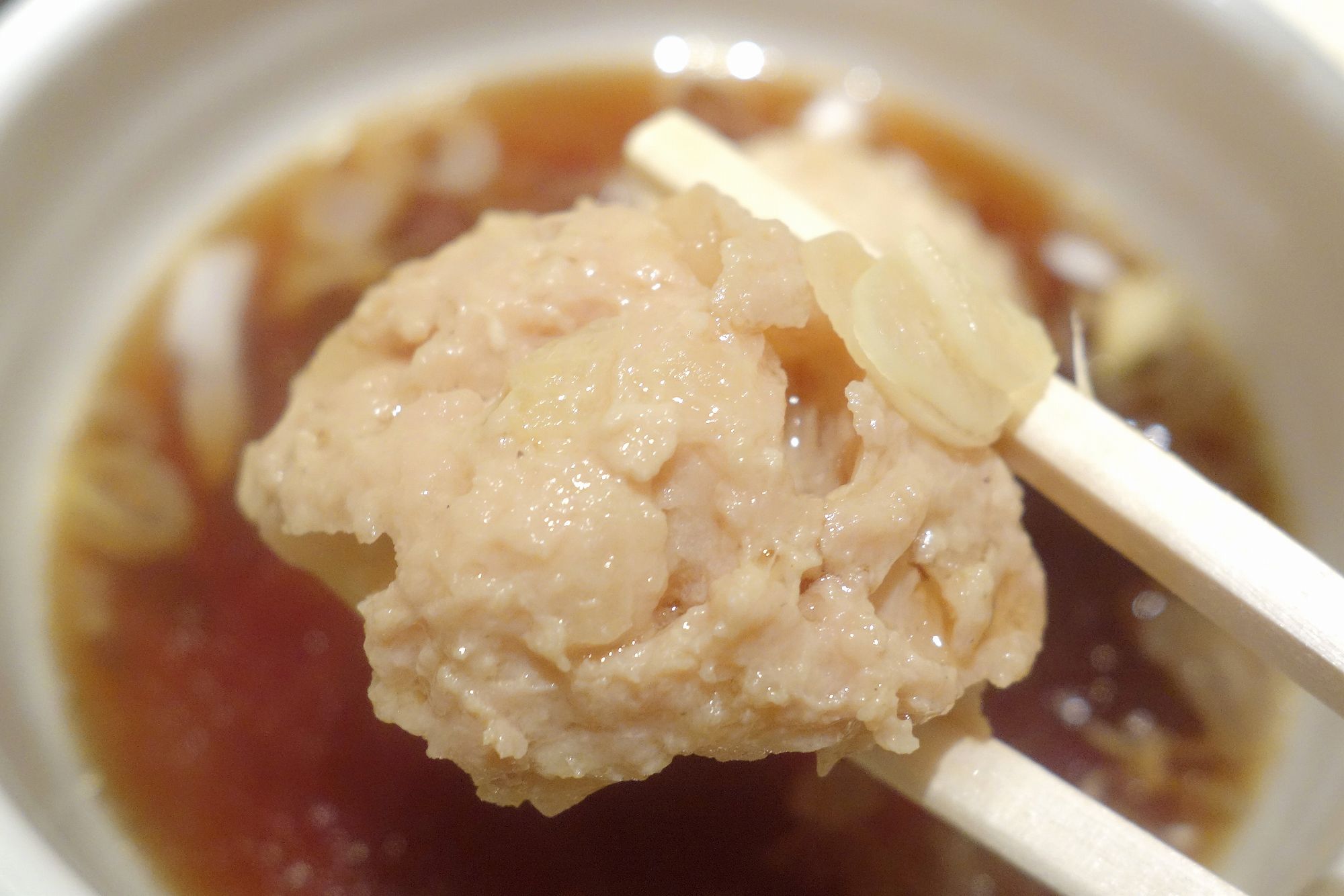まずは鶏団子から食べてみると、鶏肉の旨味に加えて、玉葱と生姜が入っていることで後味スッキリ!肉々しさと食べやすさの両方を兼ね備えた至高の一品です。