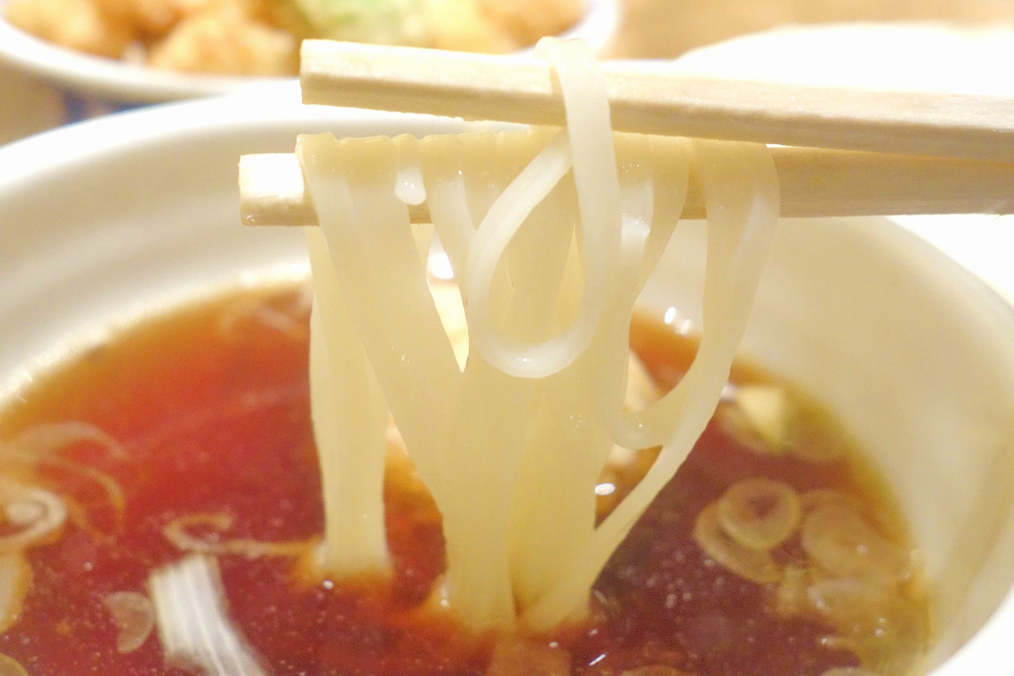 続いて稲庭うどんをつけ汁にくぐらせて食べてみると、稲庭うどんは細くコシがあってつややかな食感が感じられ、タレは出汁と甘味が効いたもので、細身の稲庭うどんとの相性もバッチリ!麺もタレも具も全てにおいてハズレのない美味しさです。