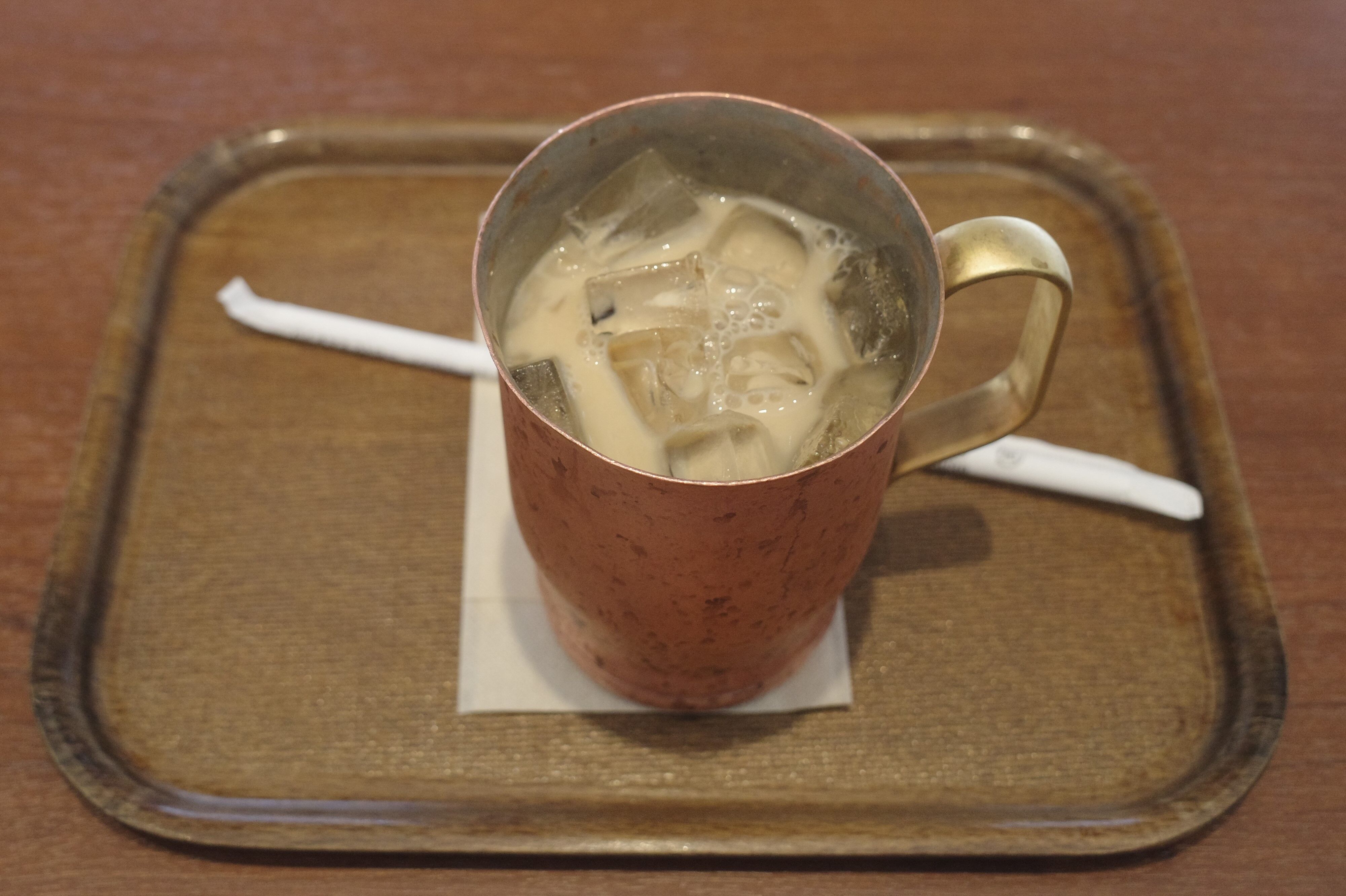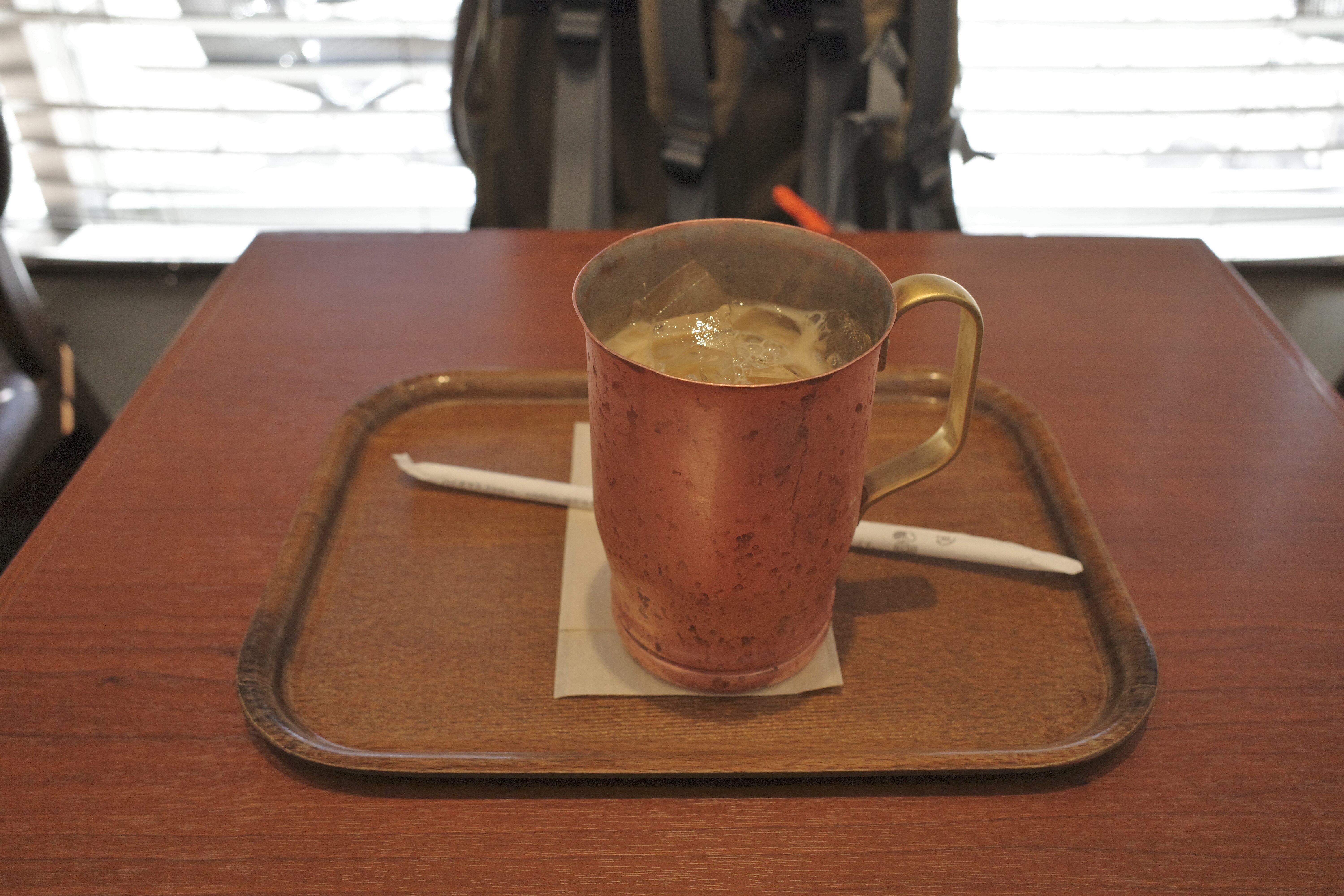 「アイスカフェオレ 無糖 ラージサイズ」は、オシャレな銅製の器に入って登場!