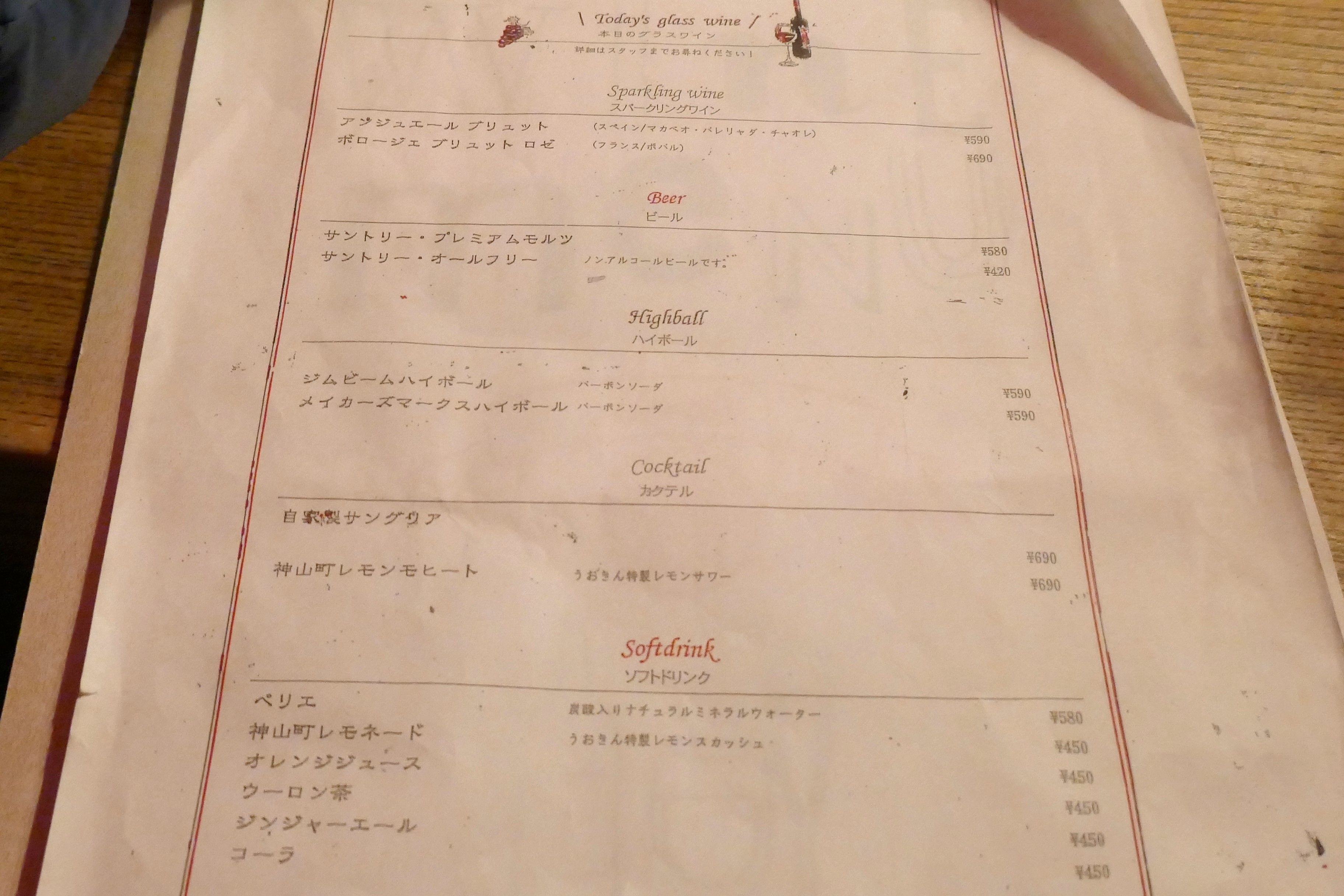 グラスワイン、ビール、ハイボール、カクテル、ソフトドリンク、各種ボトルワインでメニューは以上です。