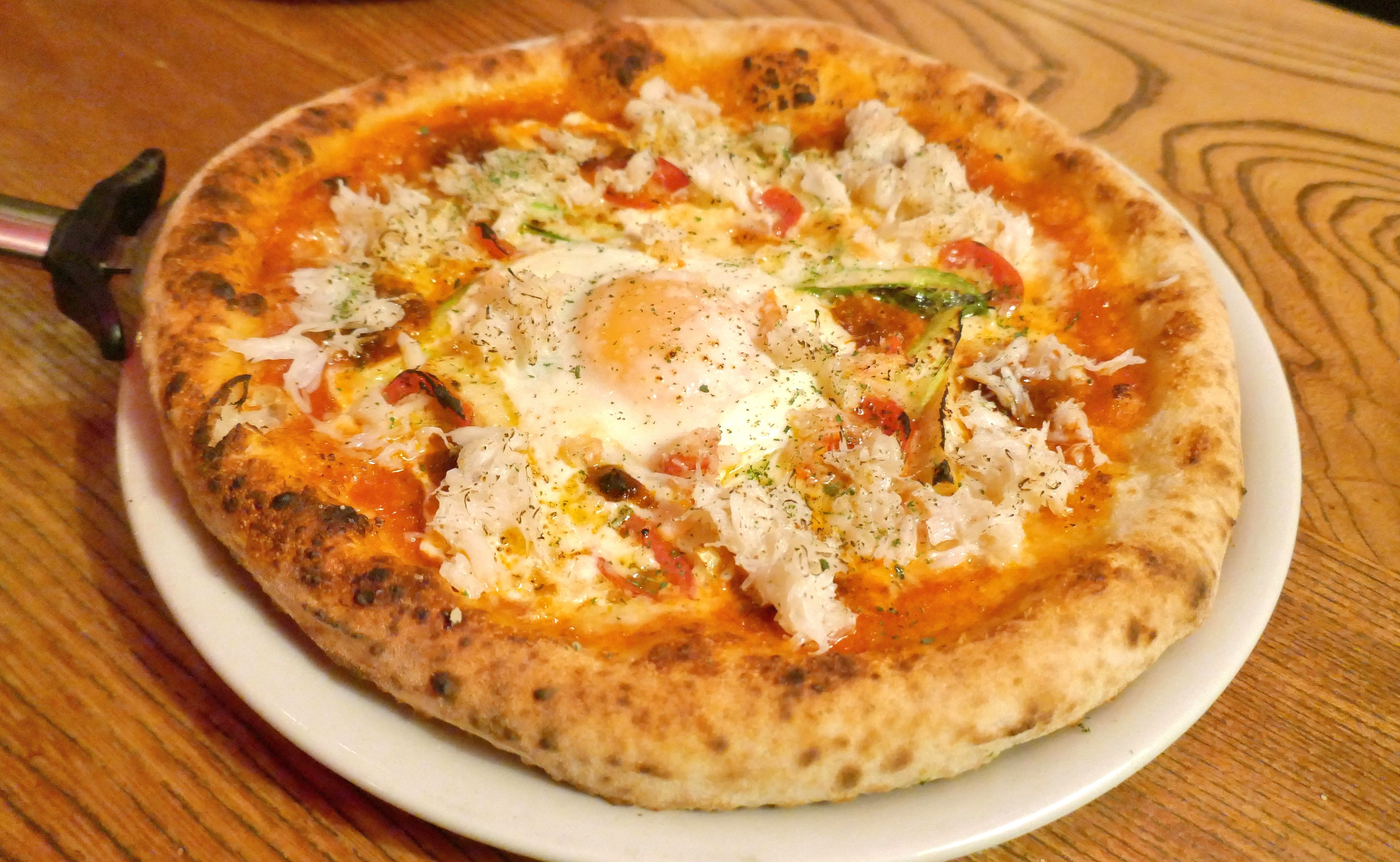 野菜のみずみずしさとともに、カニのジューシーな美味しさ、卵の滑らかな舌触りとコクがピザ生地とマッチする「ズワイガニと春野菜のビスマルクピッツァ」1580円を食べて完食!ごちそうさまでした!