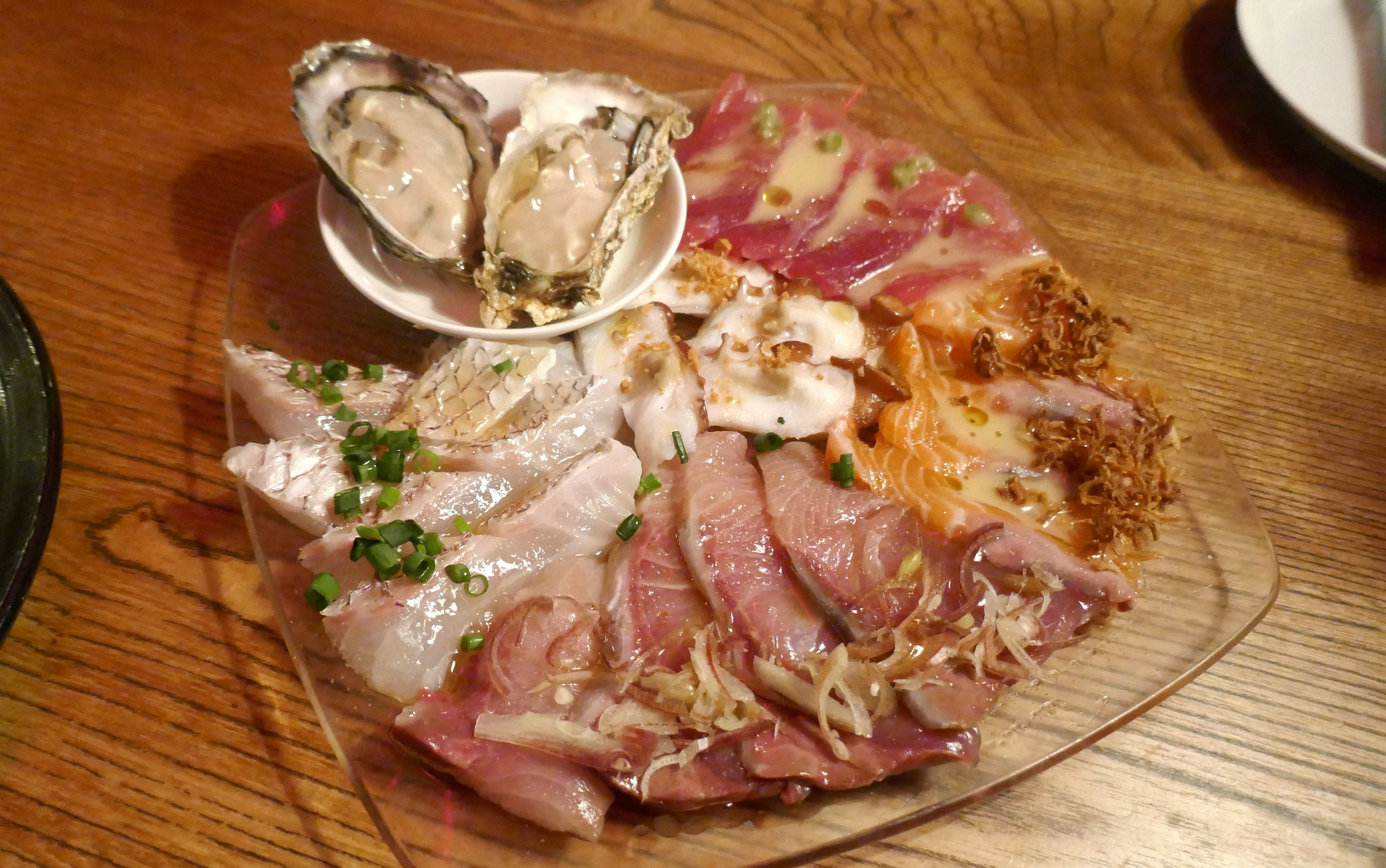 この日の「海の幸のカルパッチョ6点盛」980円は、上から牡蠣、まぐろ、サーモン、ブリ、タイ、タコがドドン!と乗って大変豪華!