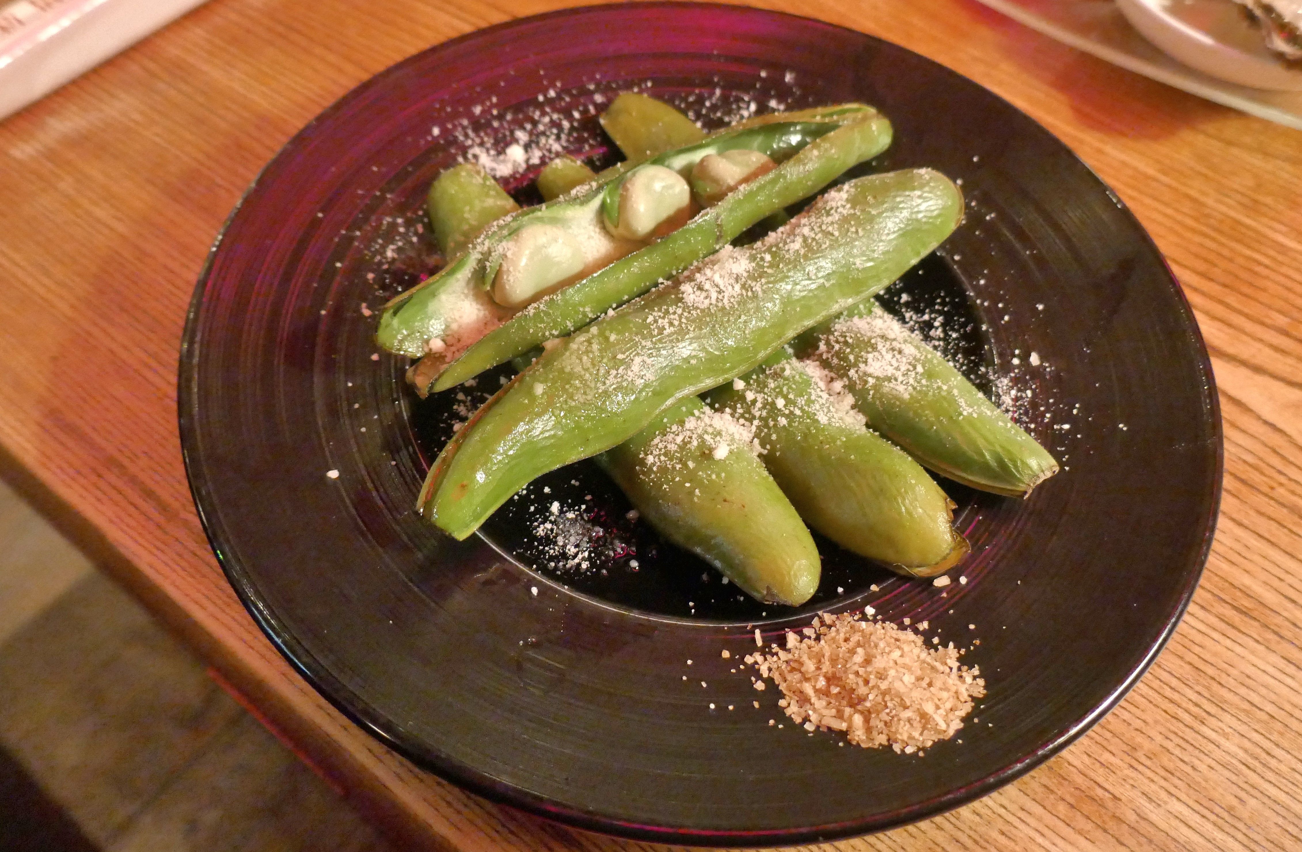 「そら豆のロースト」580円は、春らしい青々としたそら豆の風味が活きており、添えてあった茶色く染まる塩を交えて食べると中々のウマさ!