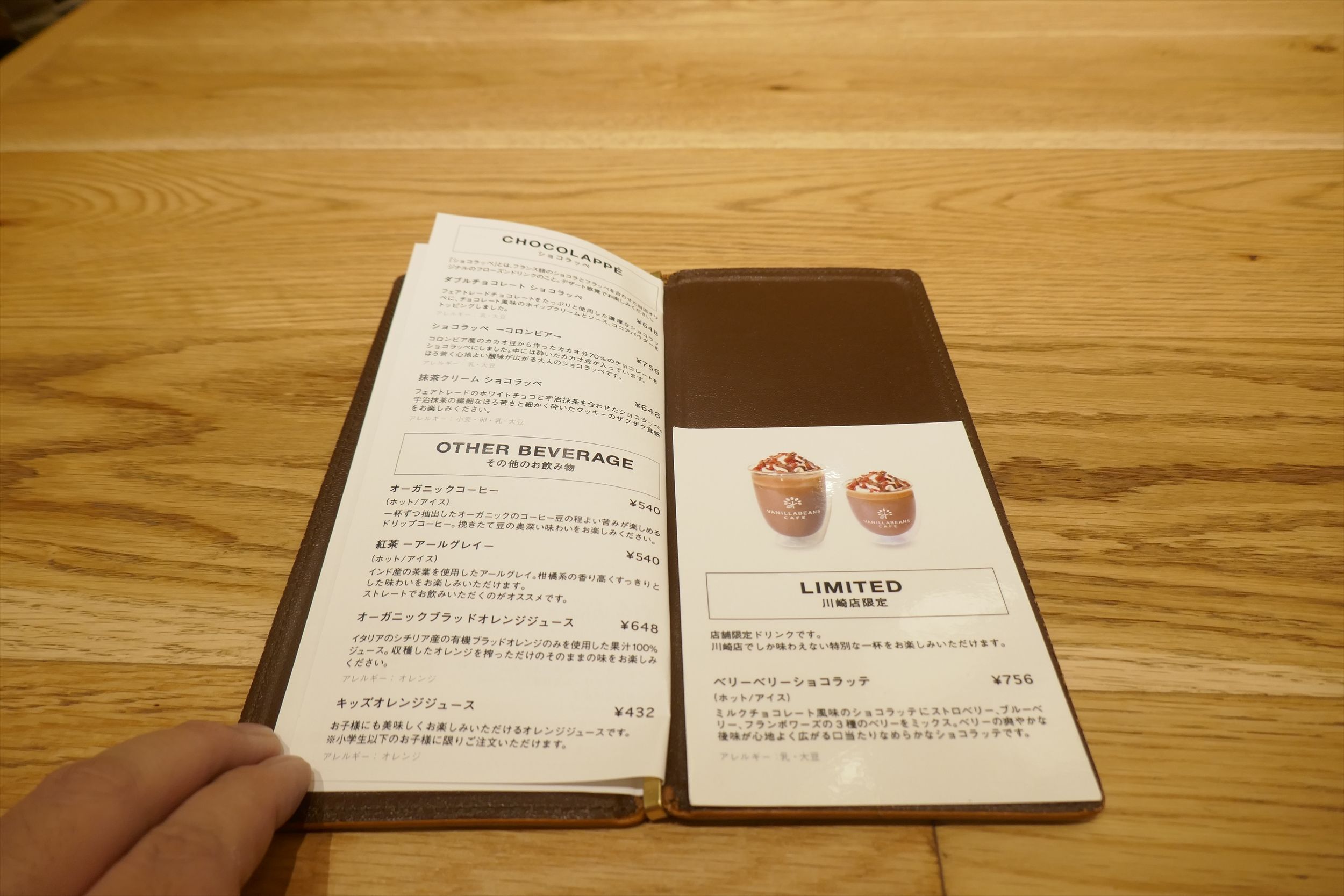 ショコラッペ、各種ドリンク、川崎店限定ドリンクのベリーベリーショコラッテでメニューは以上です。