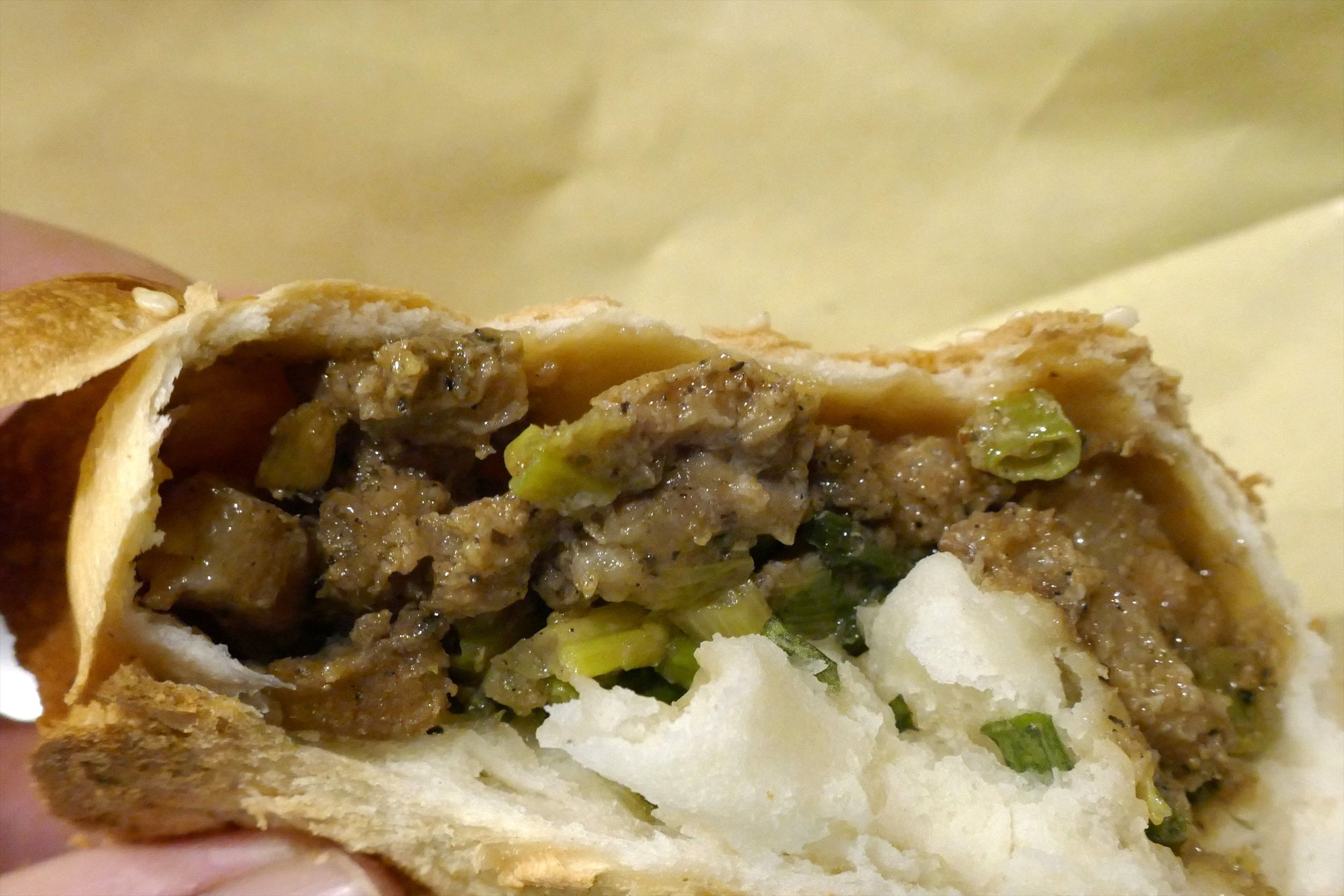 「正宗胡椒餅」は、皮面はゴマたっぷりな上にパリッと焼かれていて生地が香ばしく、中には八角の風味が効いてスパイシーなお肉、爽やかなネギなどがたっぷり!濃いめな味付けも相まって、パン生地とともにガツガツと食が進みます!