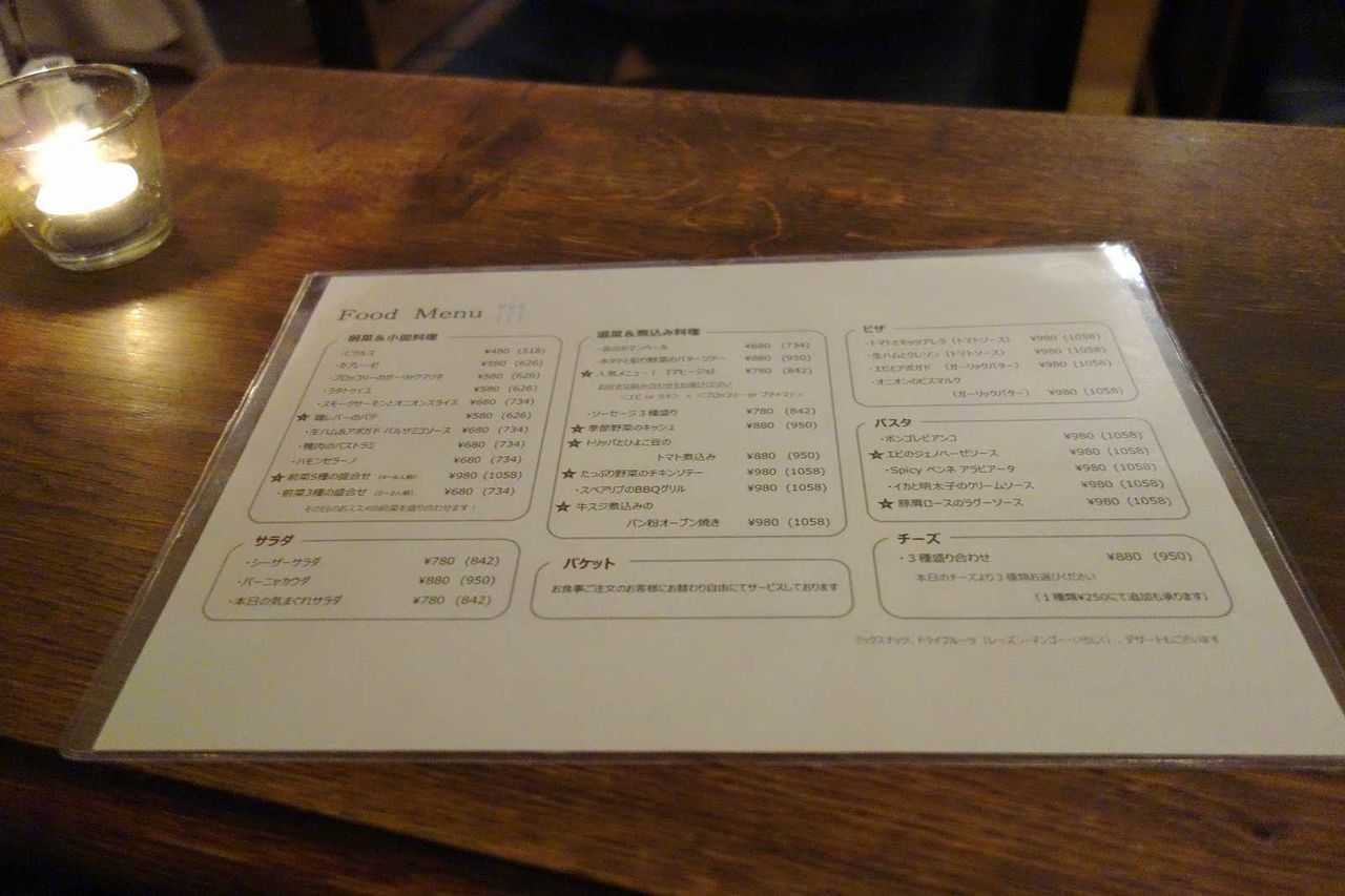 店内に移動してメニュー表を見てみると、ビール、ワインカクテル、その他飲料