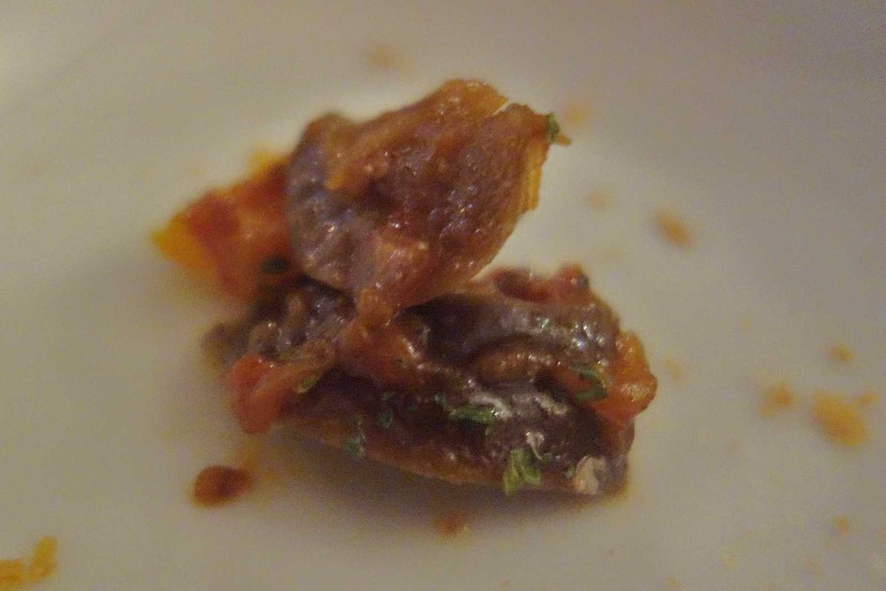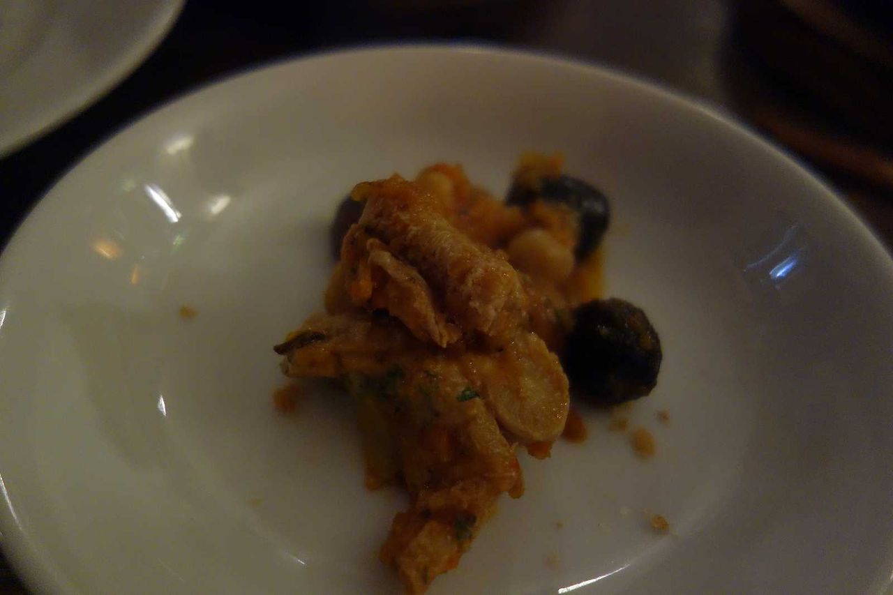 トリッパとひよこ豆のトマト煮込みはしっかり煮こまれていて汁気少なめで