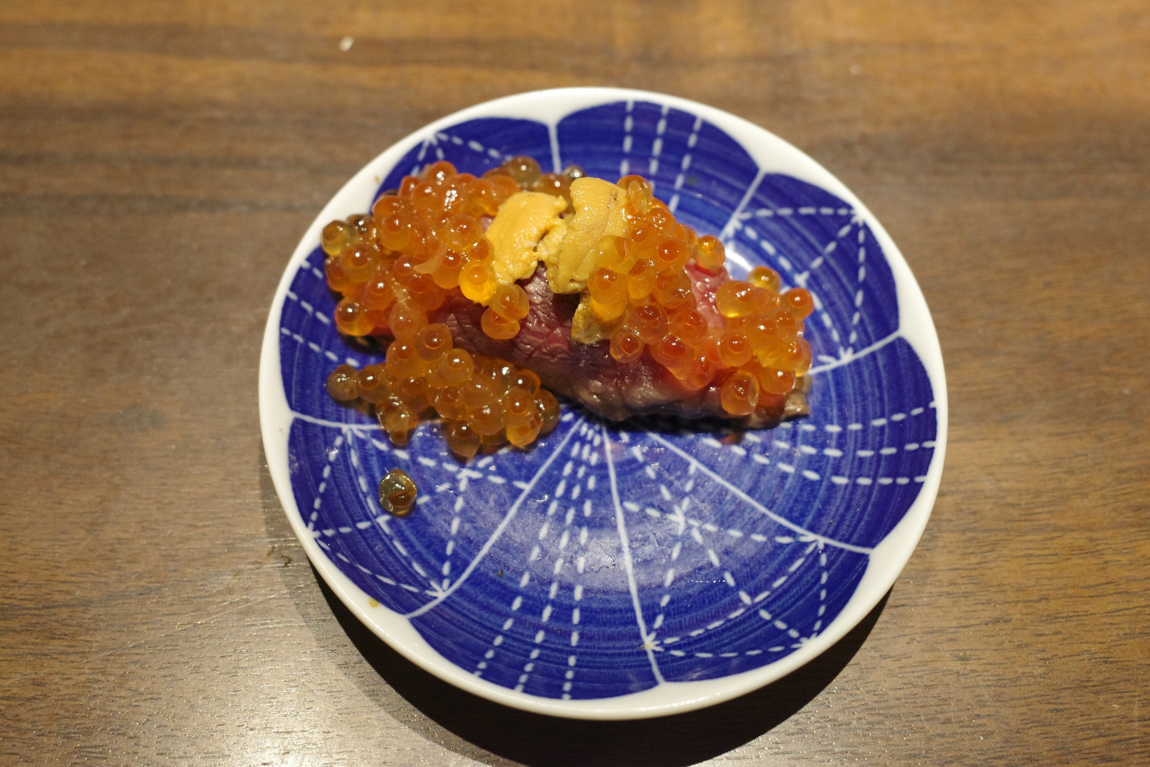 ヒレ肉を主体とした肉寿司なのでさっぱりと楽しめながらも、うにのコク、いくらの塩気がMIXして激ウマ!