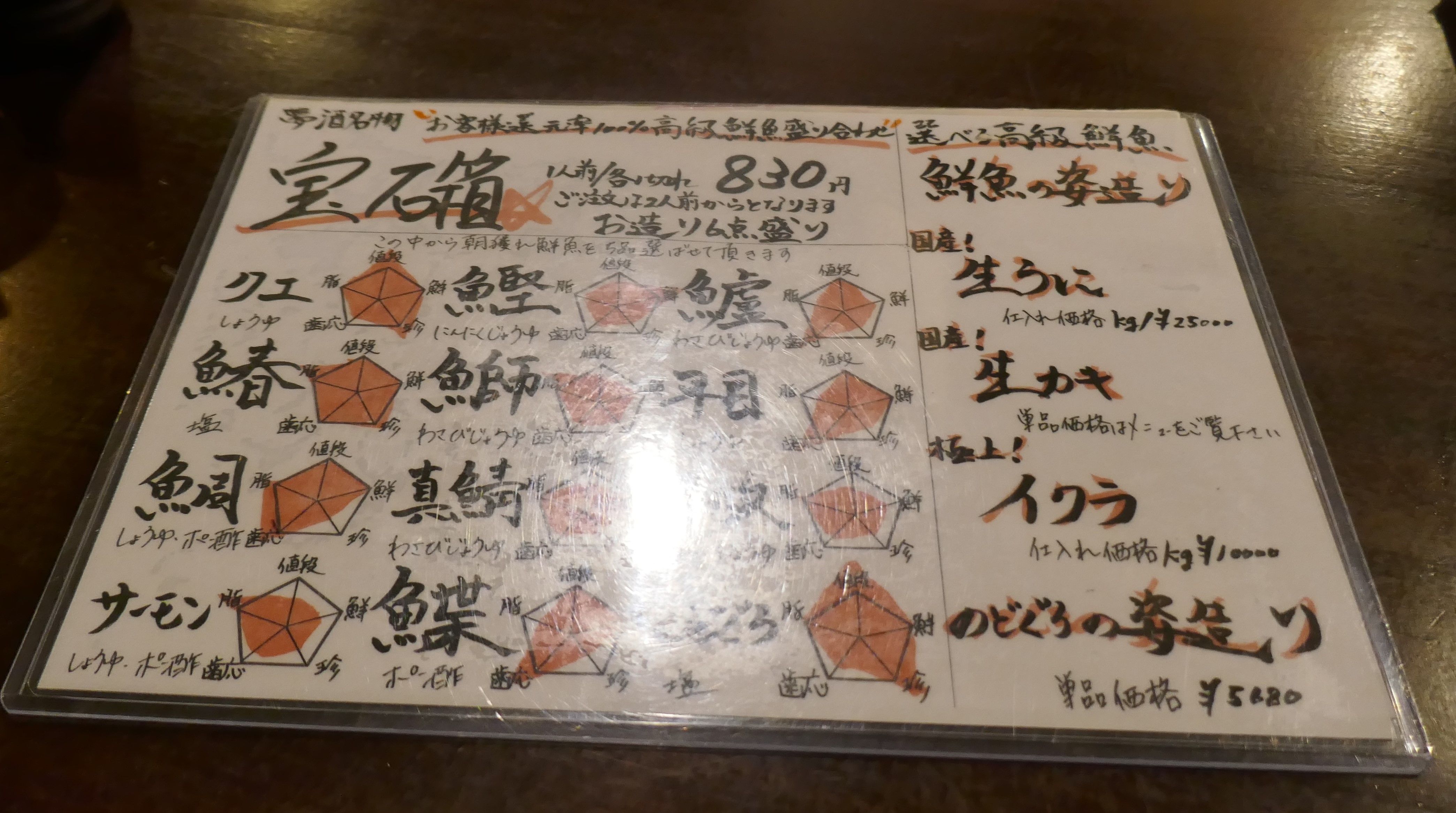 刺盛りの内容は上から時計回りに「のどぐろ」、「真鯛」、「鱸(すずき)」、「鰤(ぶり)」、「鰆(さわら)」、「鰹(かつお)」です。