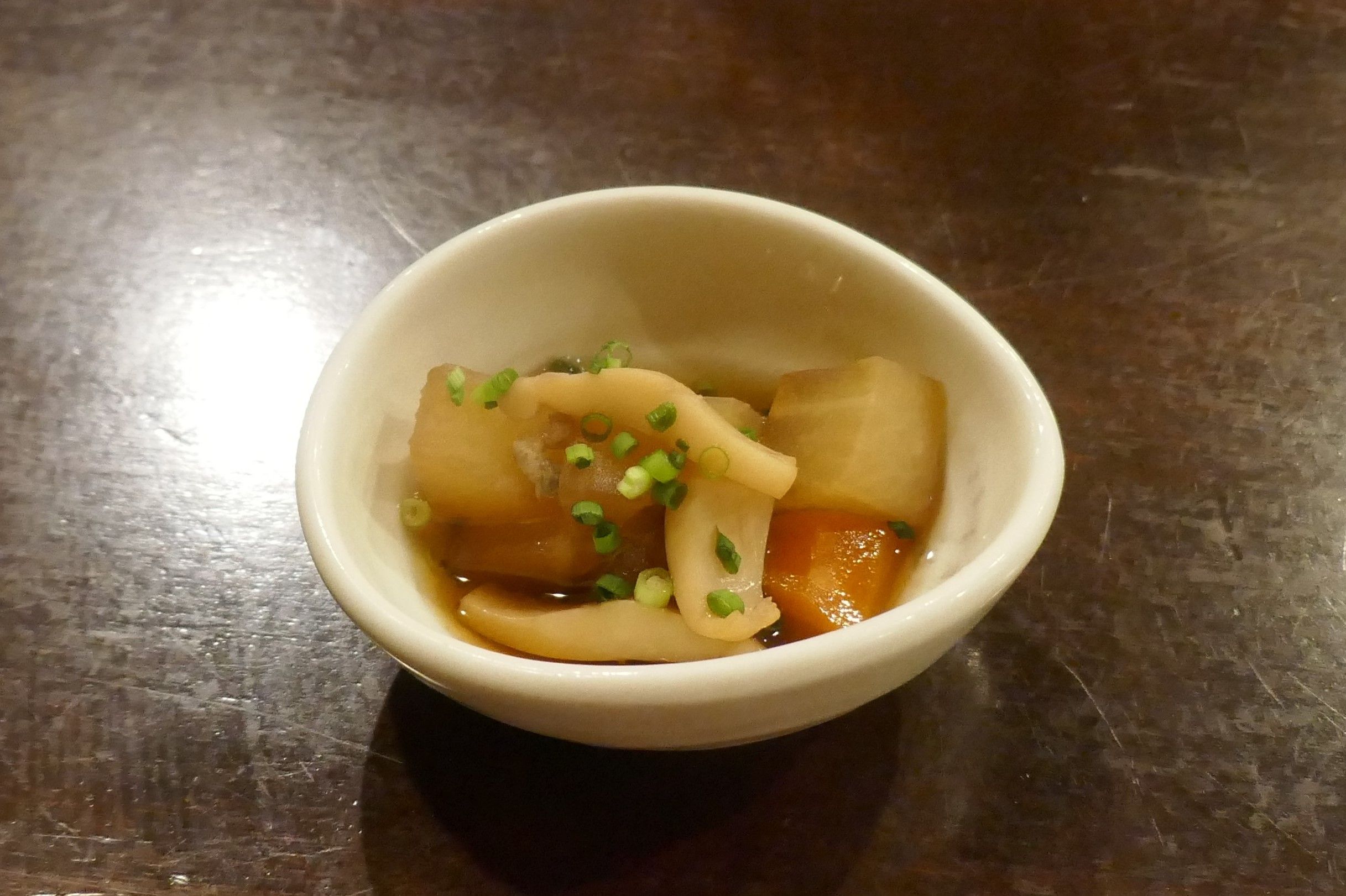 まずは、お通しの魚介入りの優しい風味の煮物をぺろり!
