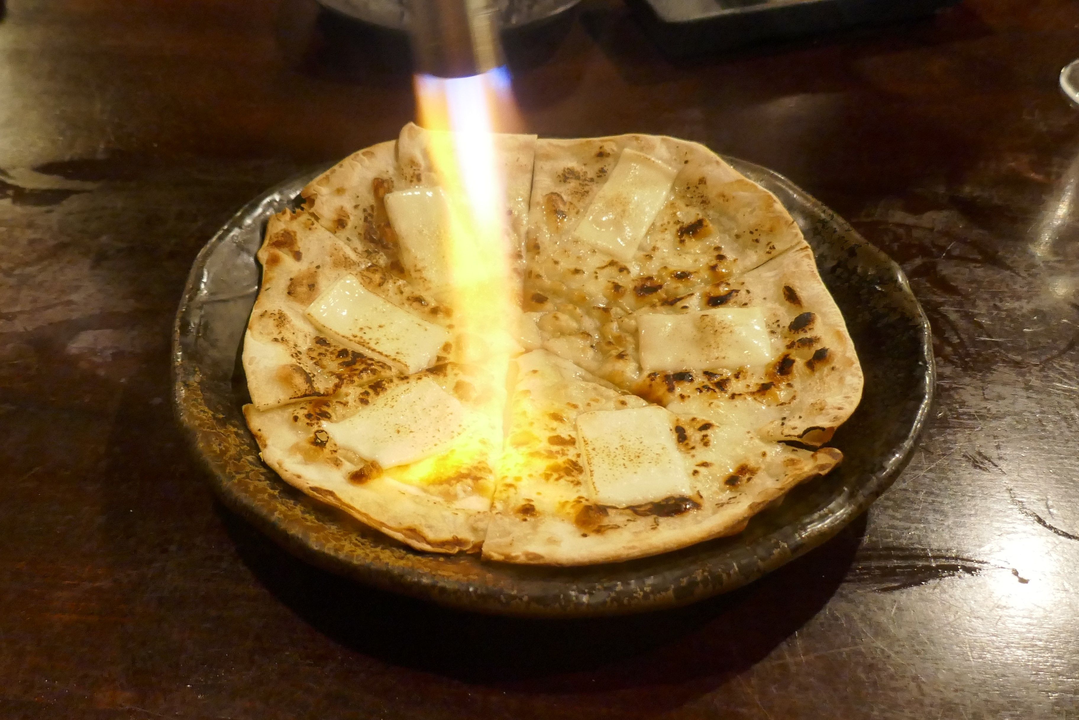 「獺祭の酒粕ピザ」790円は、出てきたと思ったら即バーナーで炙り始め